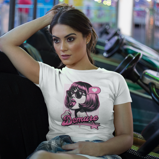 Regular price $26.00 USDRegular priceUnit price / perSale price $26.00 USD"Demure" Pink Comic Pop Art Crop Tee – Cute Lollipop Girl Graphic Top – Retro Kawaii Aesthetic